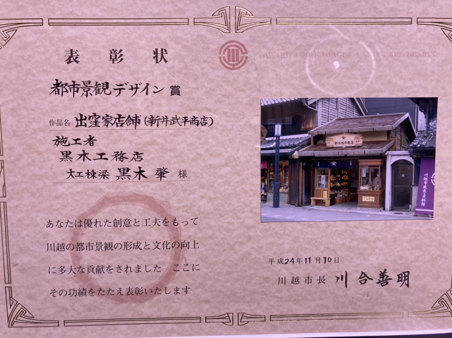 平成24年に川越市の都市景観デザイン賞をいただきました。